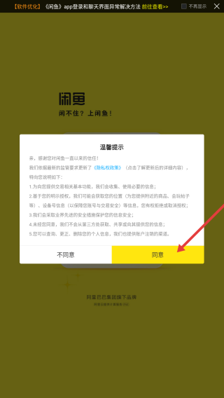 1、打开闲鱼,出现【温馨提示】界面后,点击【同意】按钮,接受隐私政策,才能进入应用主界面。