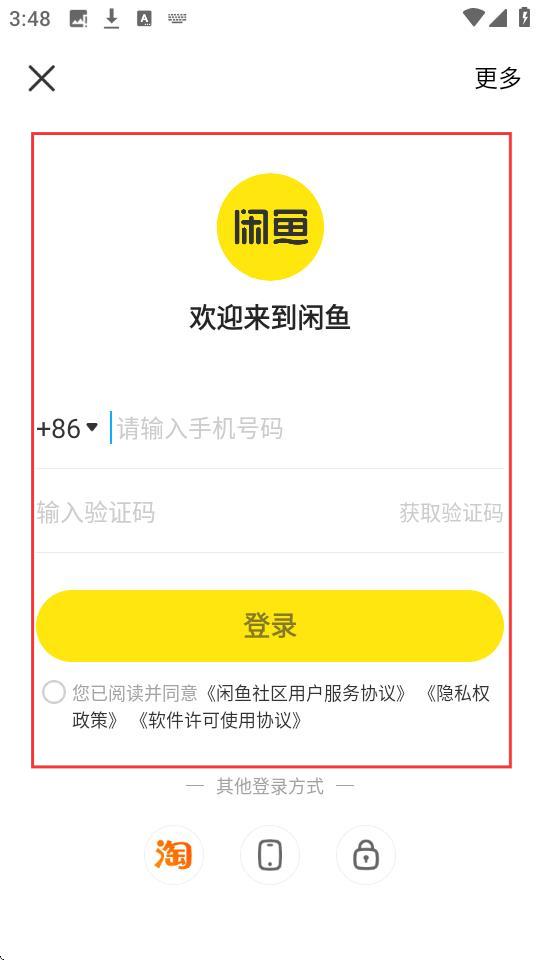 1、打开闲鱼,在登录页面输入手机号码,获取验证码,勾选协议后点击【登录】,进入闲鱼主页吧。