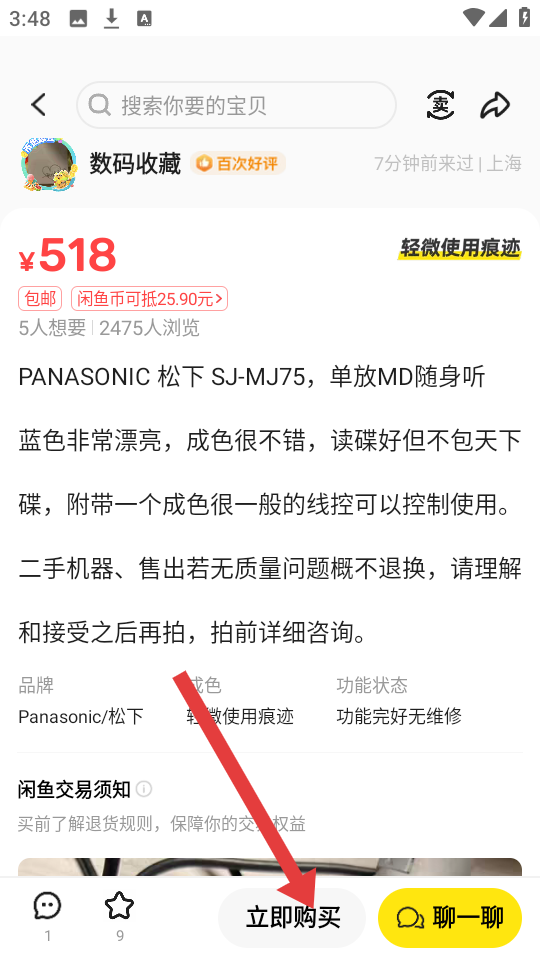 4、在商品详情页面,若确定购买,点击【立即购买】按钮,就能进入下单流程,完成商品购买啦。