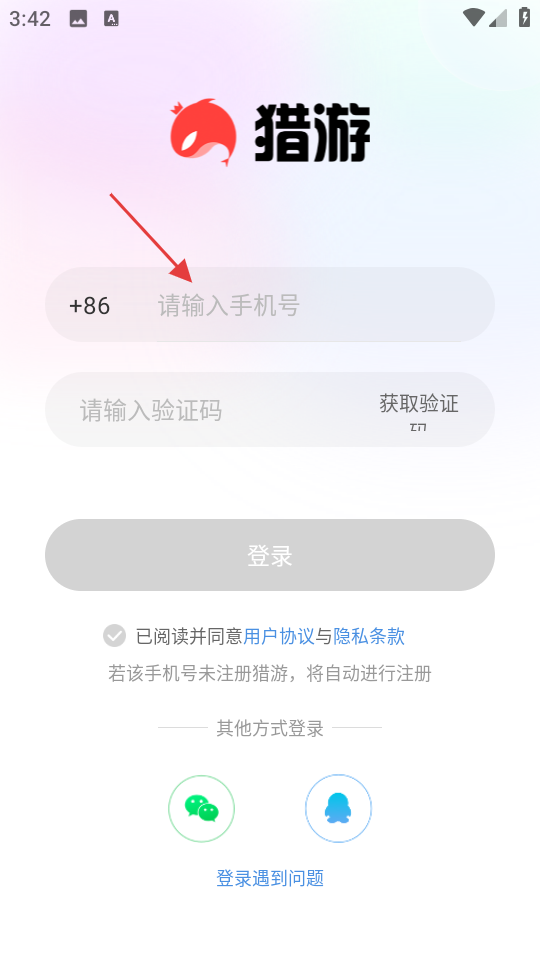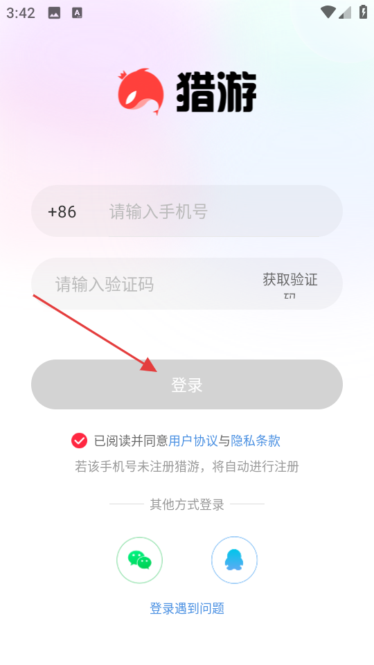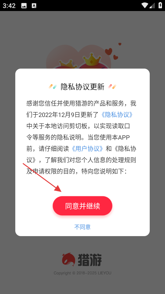 1、打开猎游APP,点击【同意并继续】接受隐私协议更新。