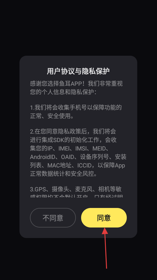 1、打开APP,点击【同意】接受用户协议与隐私保护内容。