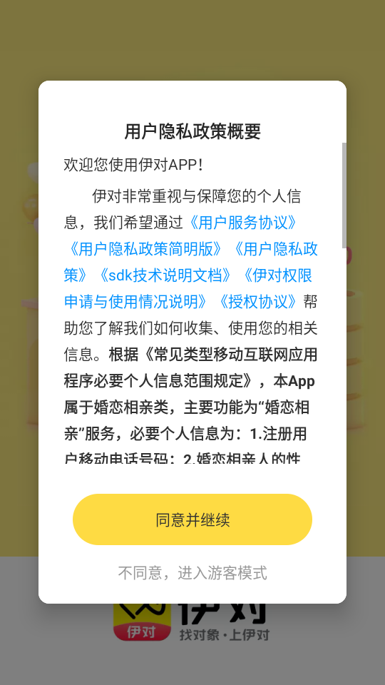 1、打开伊对APP,点击【同意并继续】接受用户隐私政策。