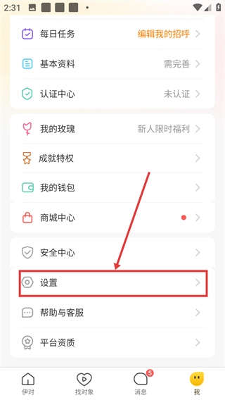 2、进入个人中心后,找到并点击【设置】选项,可进入设置界面,找到隐私相关的配置项哦。