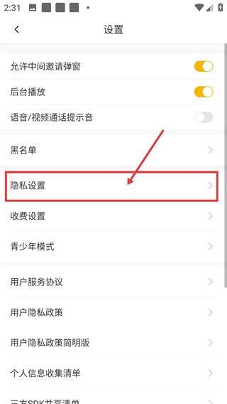 3、在设置界面,点击【隐私设置】选项,可进入隐私配置页面,调整个人信息的展示权限啦。