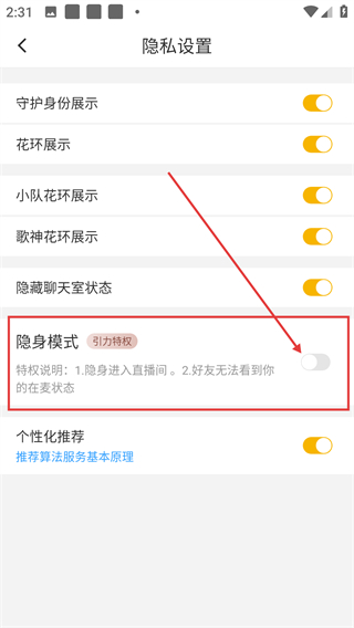 4、在隐私设置页面,点击【隐身模式】的开关,可开启该功能,隐身进入直播间且好友无法看到在线状态哦。