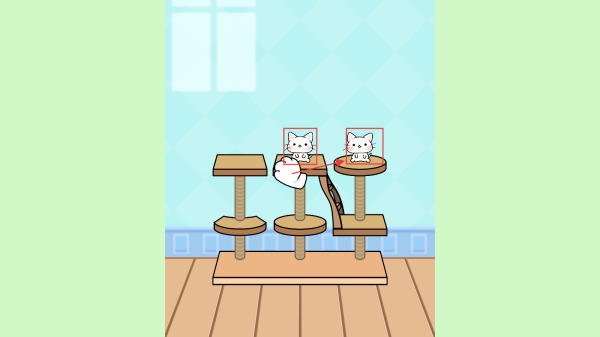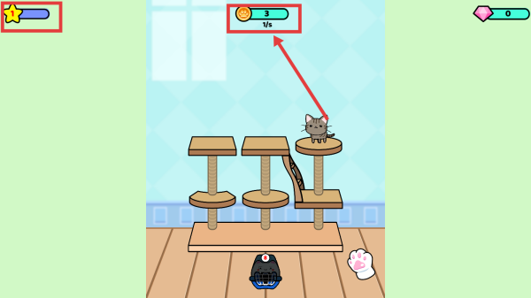 1、点击猫爬架上的猫咪滑动,把两只猫合成为高级别的猫。