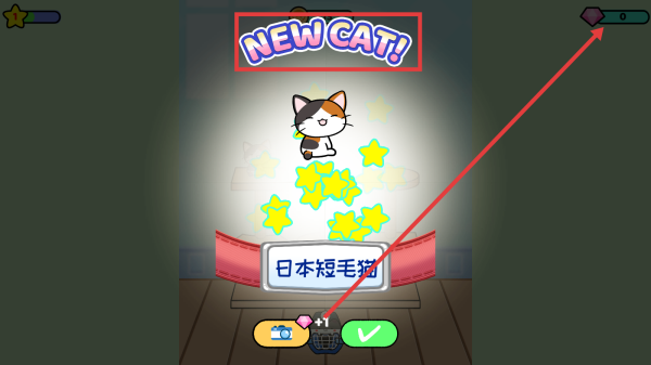 3、当出现【NEWCAT!】提示时,成功获取新猫咪(如日本短毛猫),同时注意钻石资源变化。