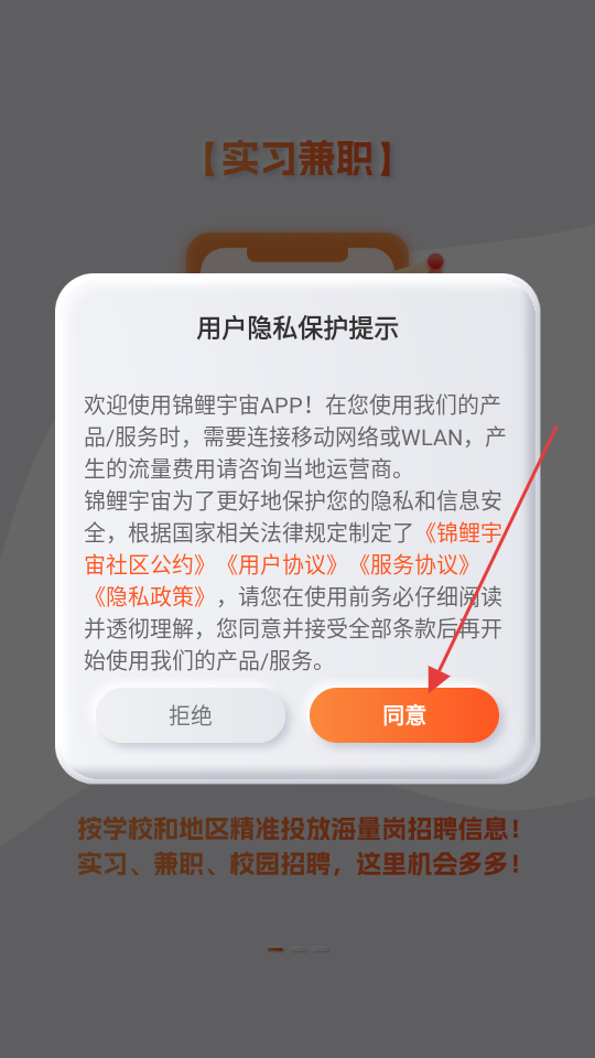 1、打开锦鲤宇宙APP,点击【同意】接受用户隐私保护提示。
