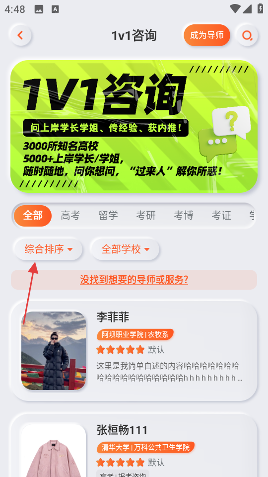 3、在1v1咨询界面,点击【综合排序】可对导师进行排序筛选。