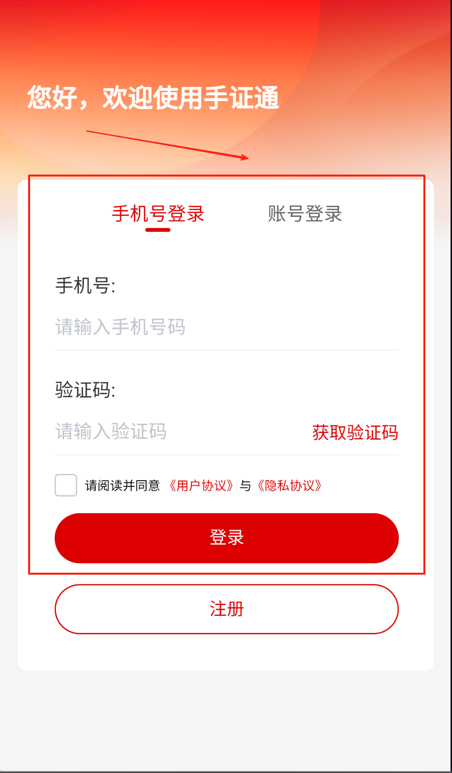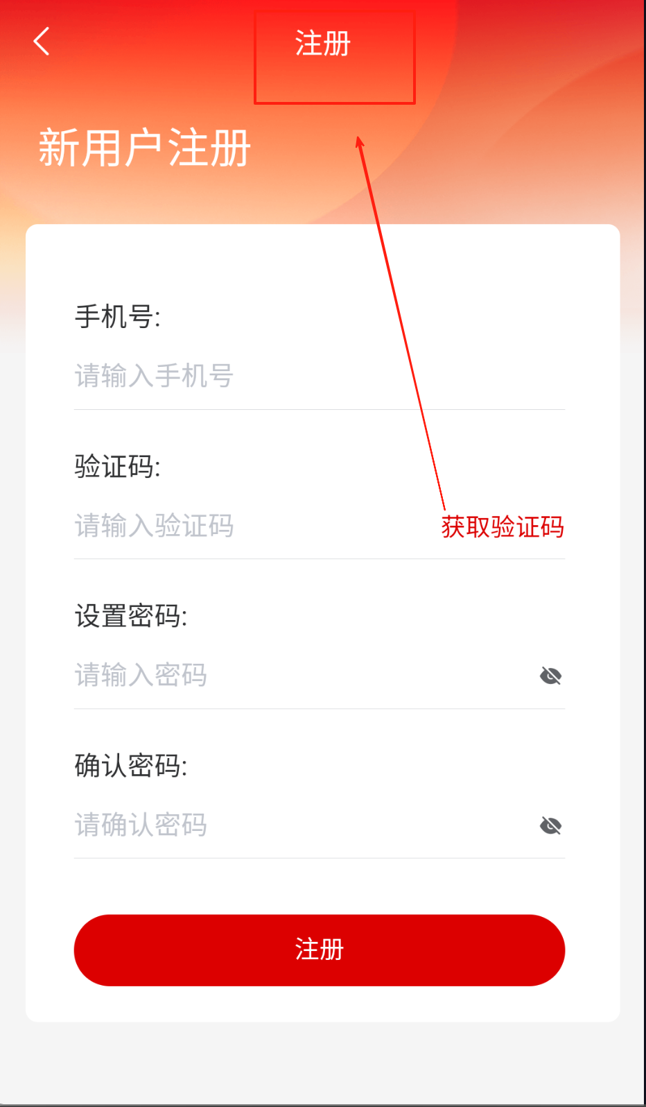 1、打开软件进入登录页,点击“注册”按钮进入新页面,填写手机号时注意别输错数字,输入框右边有格式提示可以对照。