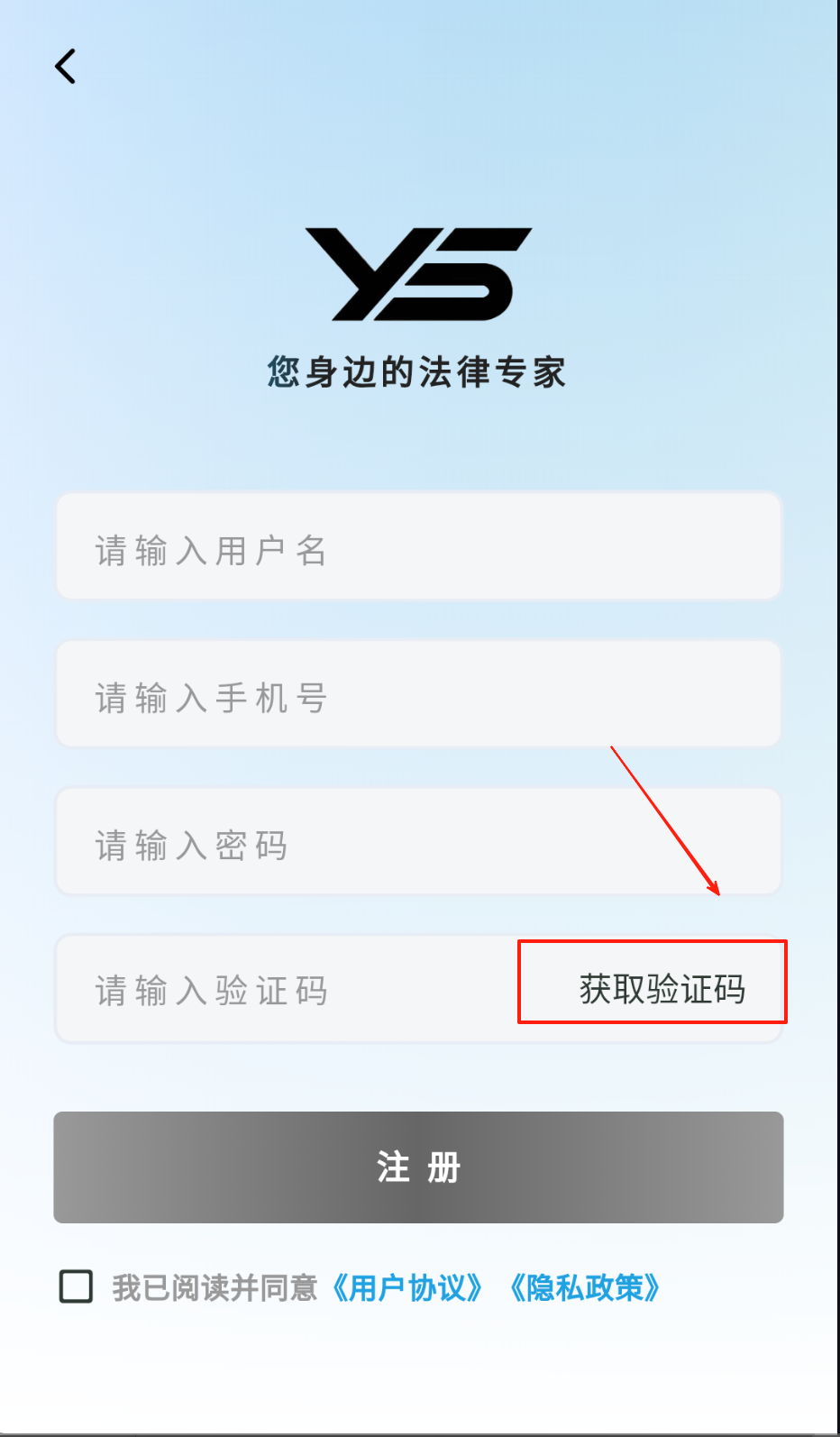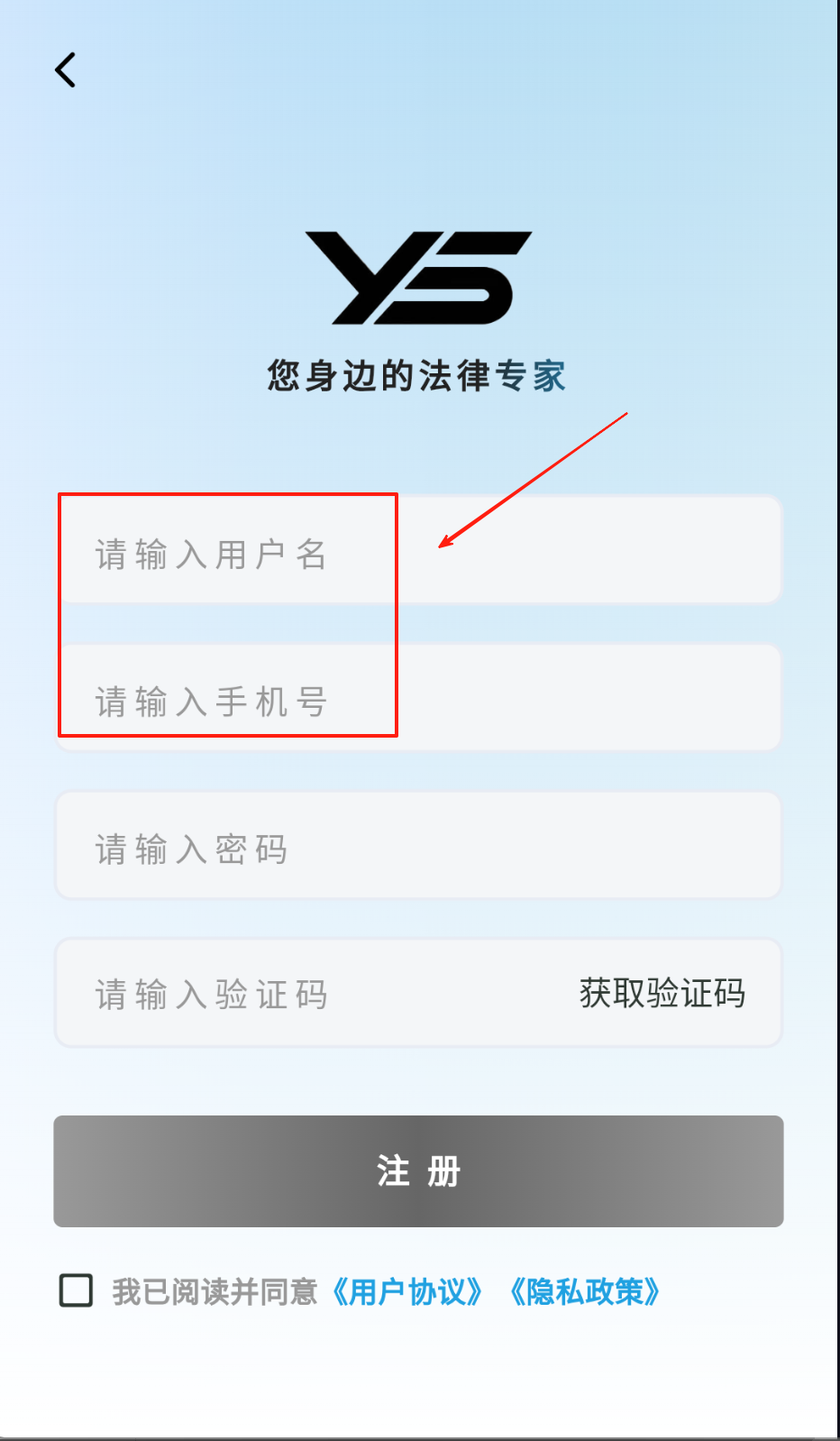 1、打开软件看到浅蓝色背景的注册页,先在“用户名”框输入字母或数字组合,注意别用奇怪的符号,手机号要填正在用的号码别输错啦。
