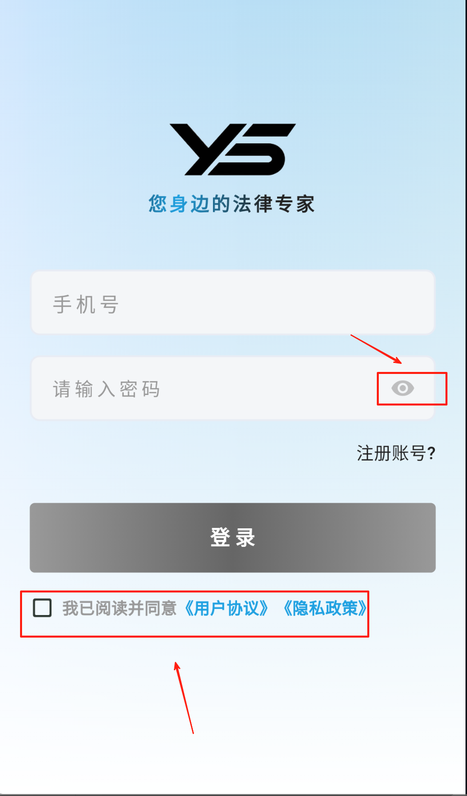 3、登录时输入注册的手机号和密码,密码栏右边的小眼睛能切换显示内容,确认无误后勾选协议,点击蓝色登录按钮就能进主界面了。
