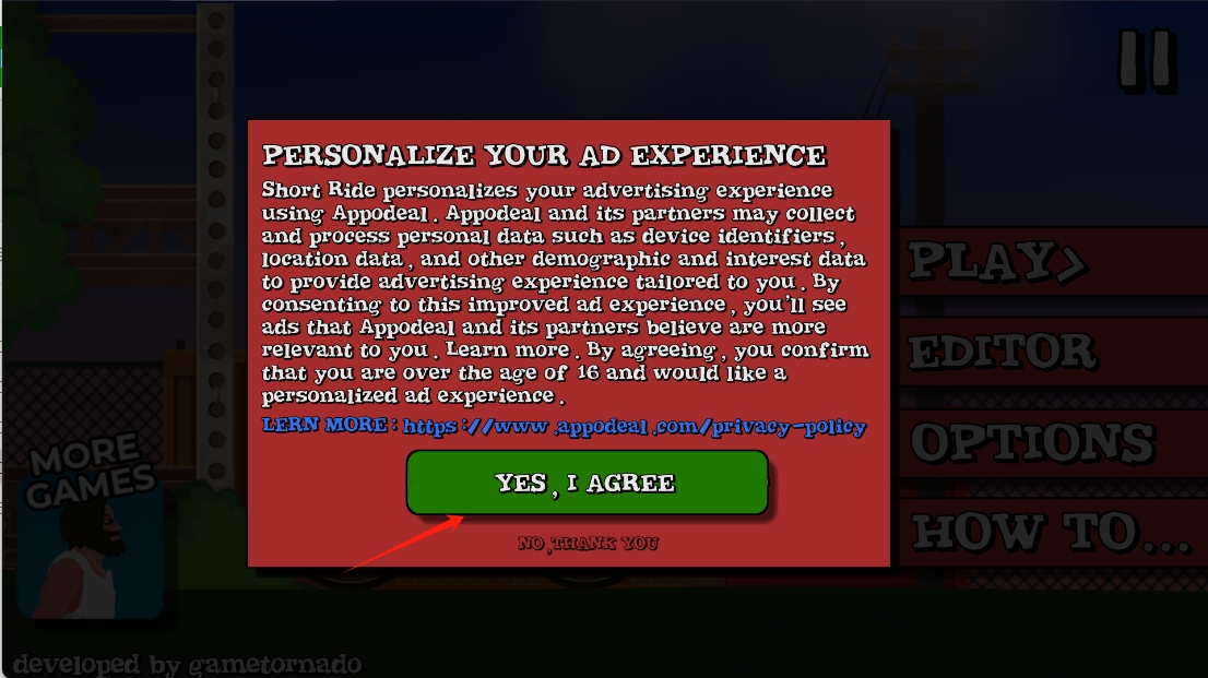 1、同意个性化广告体验,点击“YES, I AGREE”按钮,允许Appodeal收集和处理个人数据以提供定制广告。