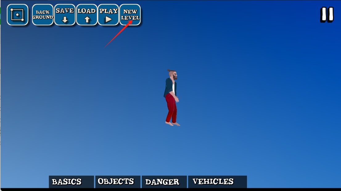 3、在编辑模式中,点击“NEW LEVEL”创建新关卡,点击“PLAY”开始游戏,或点击“SAVE”保存当前进度。