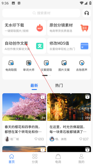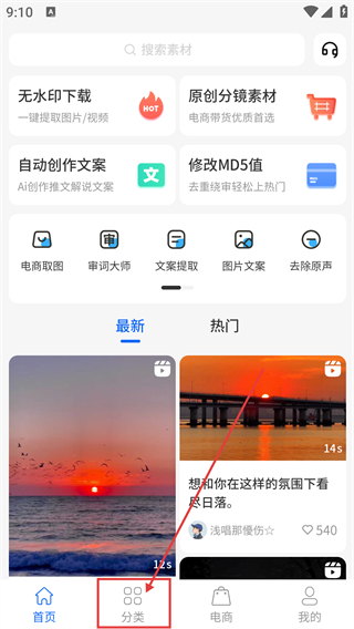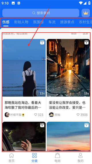 1、在平台首页,点底部【分类】选项能进入素材分类页,可按风格筛选想要的素材内容哦。