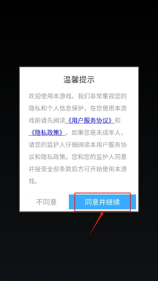 1、同意协议:在游戏启动前,仔细阅读并同意《用户服务协议》和《隐私政策》后,点击“同意并继续”。