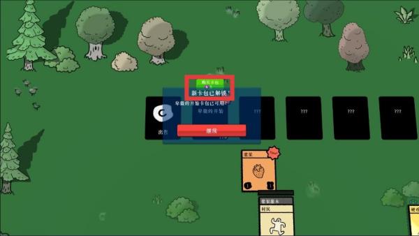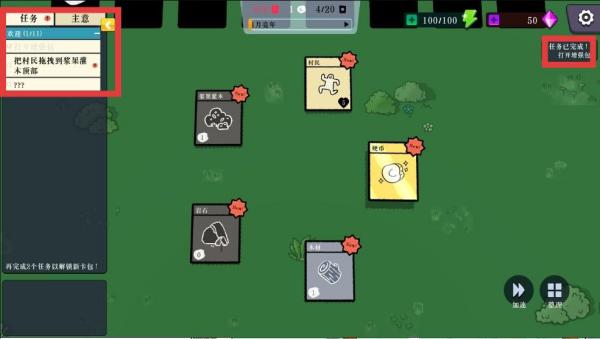 3、按照【任务】栏提示操作,如将【村民】拖拽到【浆果灌木】顶部完成任务,获取奖励并推进游戏进程,争取解锁更多新卡包。