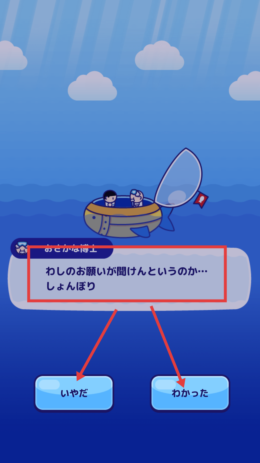 1、当听到おとかな博士说「わしのお願いが聞けんというのか…しょんぼり」时,可根据游戏情境选择回应选项「いやだ」或「わかった」。