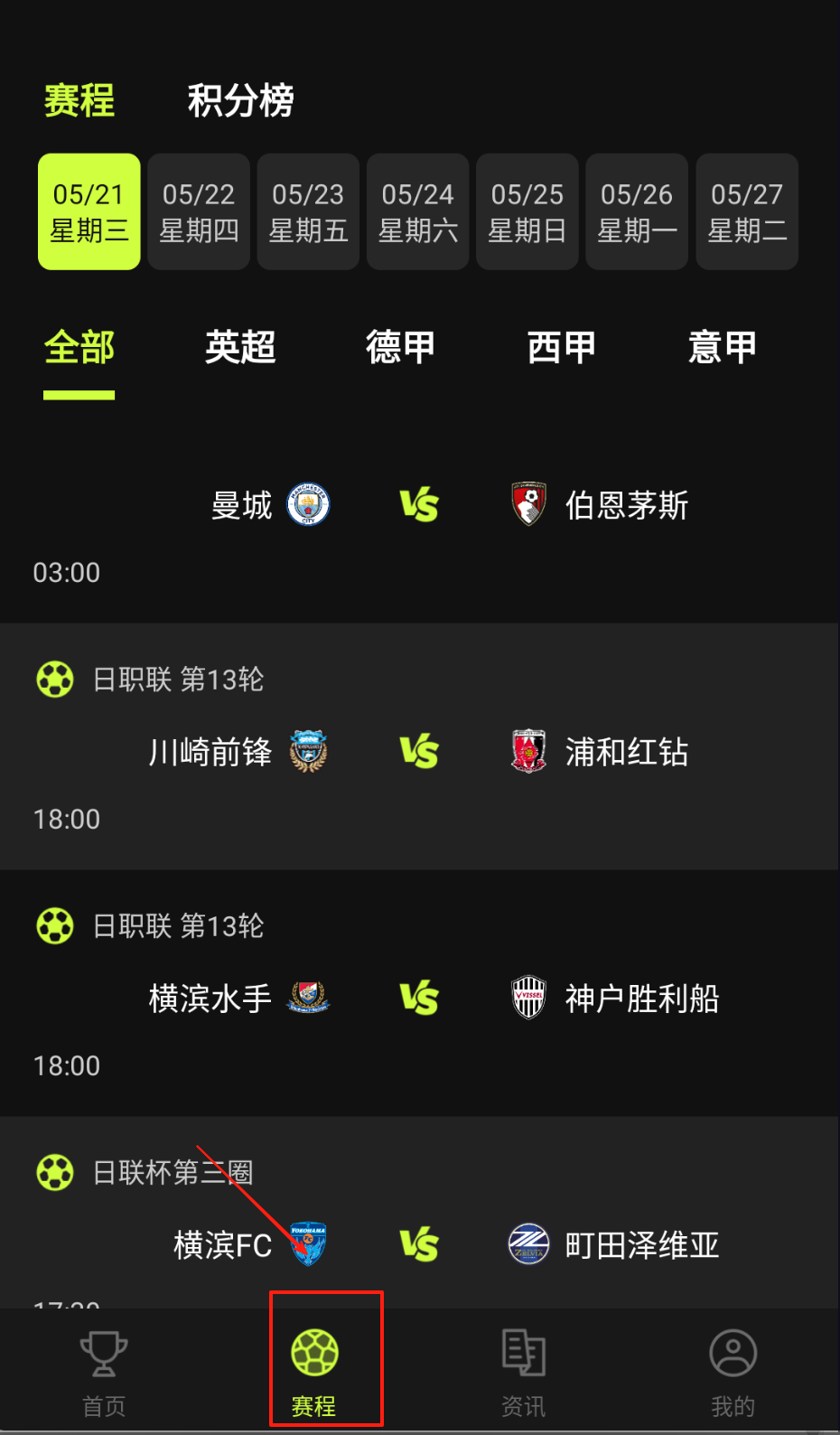 2、主界面"赛程"板块按日期排列赛事,绿色高亮当天比赛,点击英超/欧冠等标签,快速查看伯恩茅斯VS西汉姆联等具体开球时间。