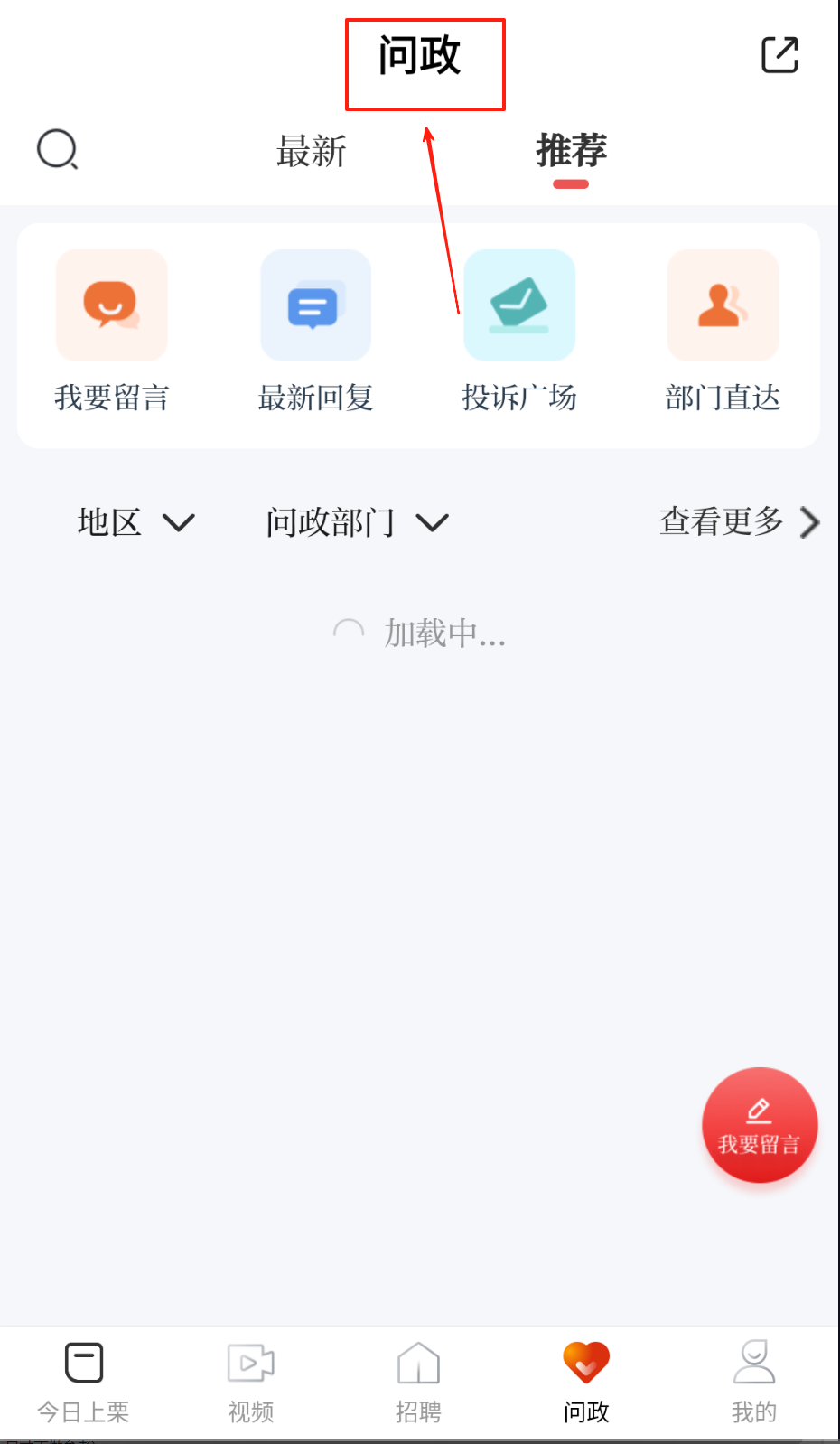 3、通过底部导航栏切换至民声问政模块,可直接向入驻政务机构提交咨询或查看官方政策解读。