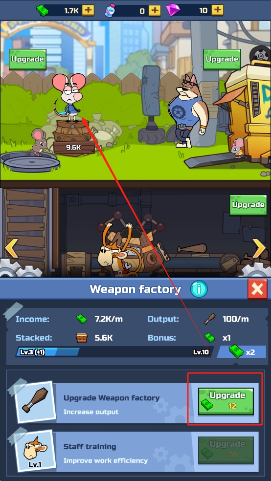 4、升级设施:在游戏中,点击“Upgrade”按钮升级武器工厂以提高生产效率。