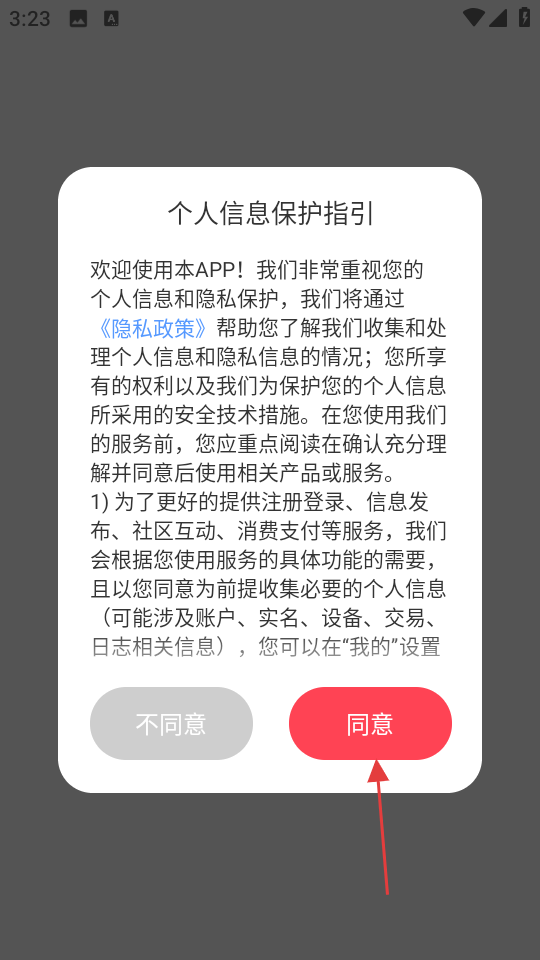1、打开APP,点击【同意】接受个人信息保护指引。