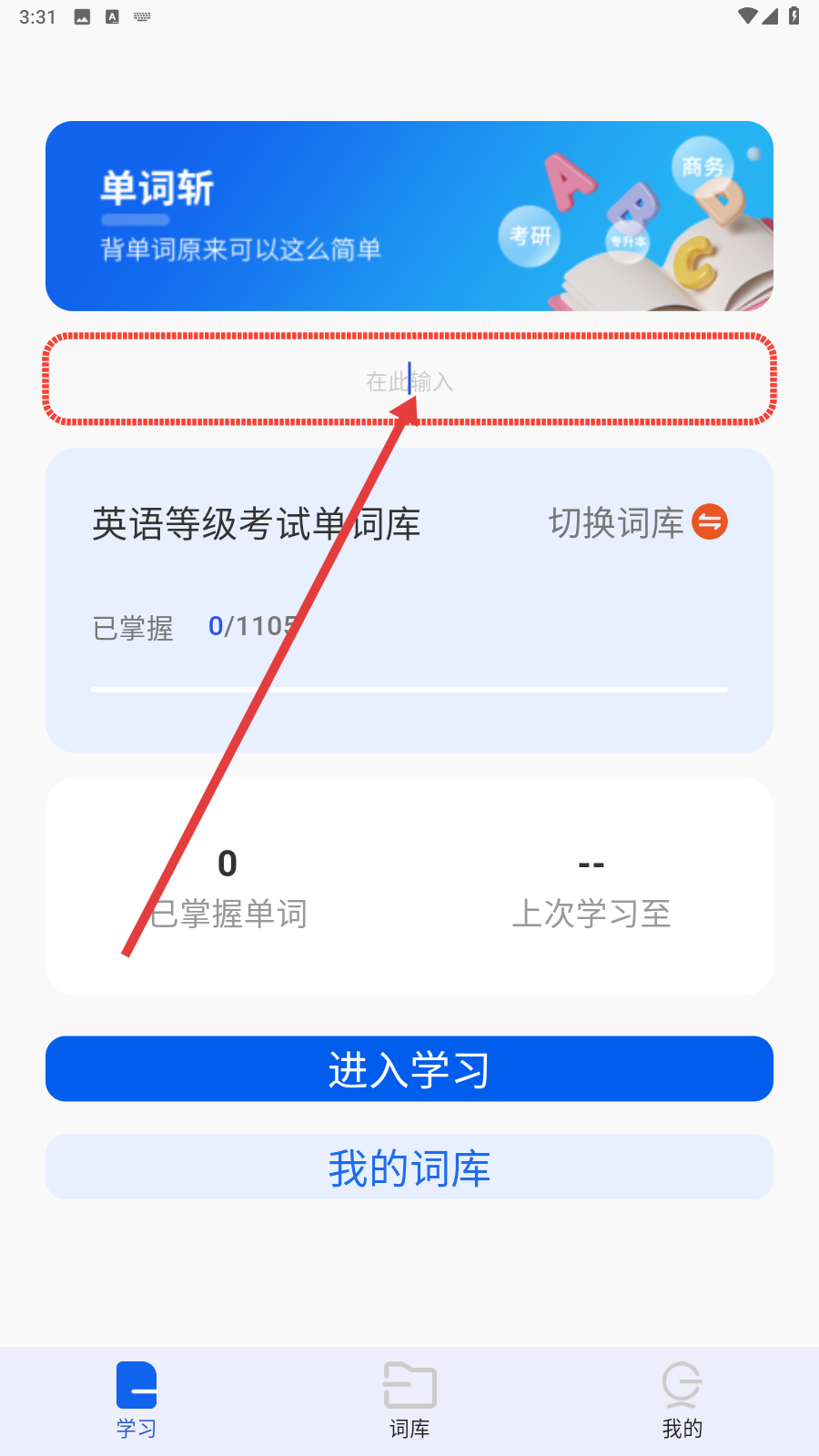 1、打开【单词斩】应用,在首页的输入框【在此输入】搜索单词,或选择【英语等级考试单词库】等词库,点击【进入学习】开启背单词。