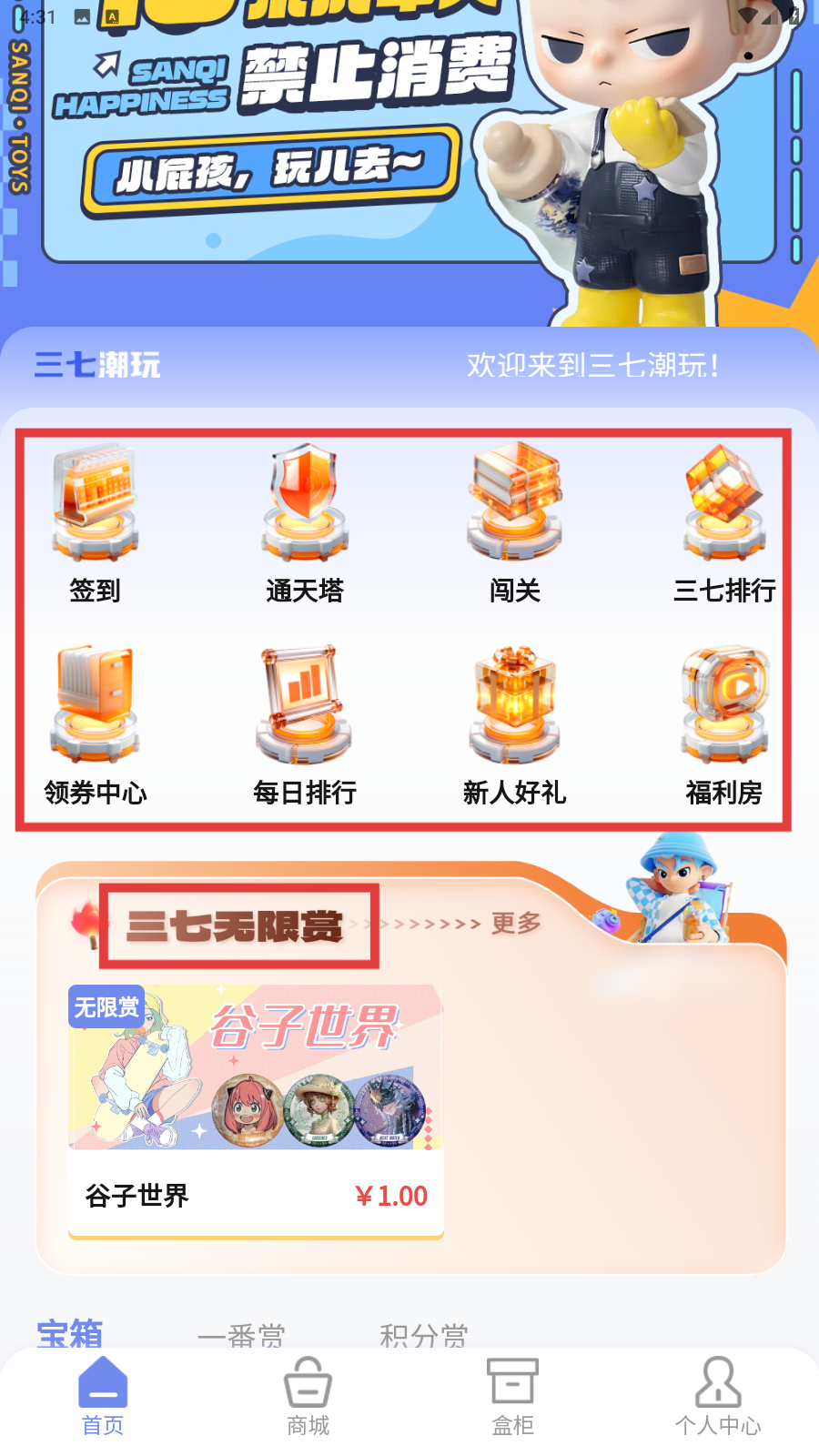 1、打开【三七潮玩】应用,在首页可参与【签到】【通天塔】【闯关】等活动,点击【三七无限赏】进入抽奖页面,如【谷子世界】。