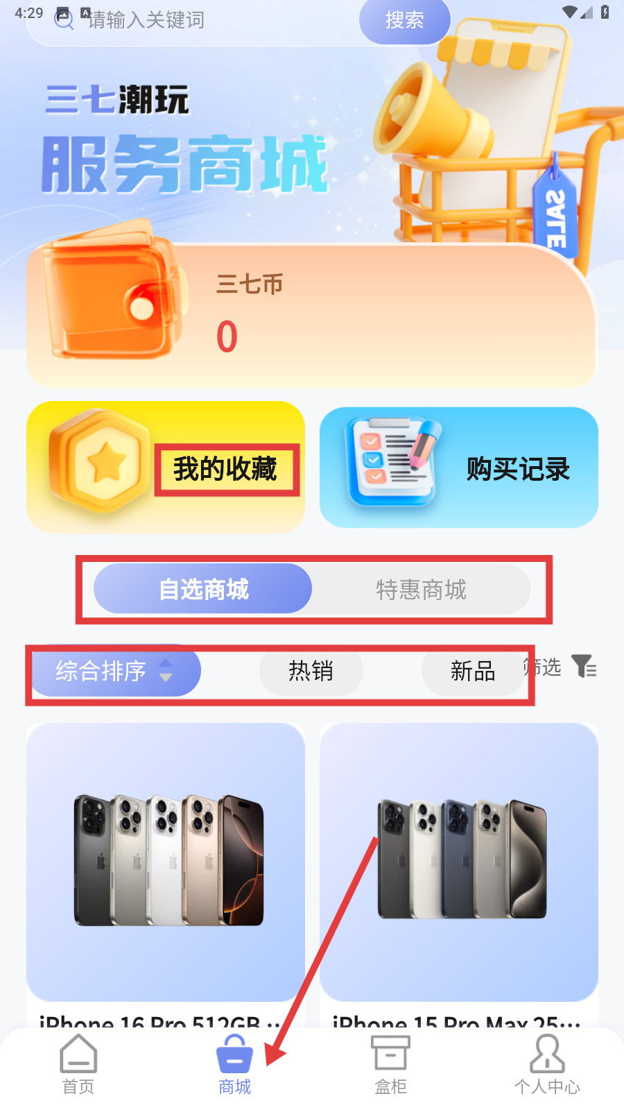 3、进入【商城】页面,可查看余额,通过【我的收藏】和【购买记录】管理收藏与订单,在【自选商城】和【特惠商城】筛选需购买商品。