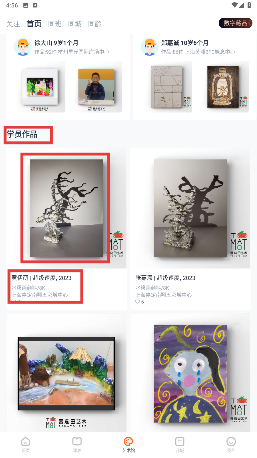 2、进入【艺术馆】页面,浏览【学员作品】,如【黄伊萌|超级速度,2023】等作品,可了解其他学员创作,获取灵感。