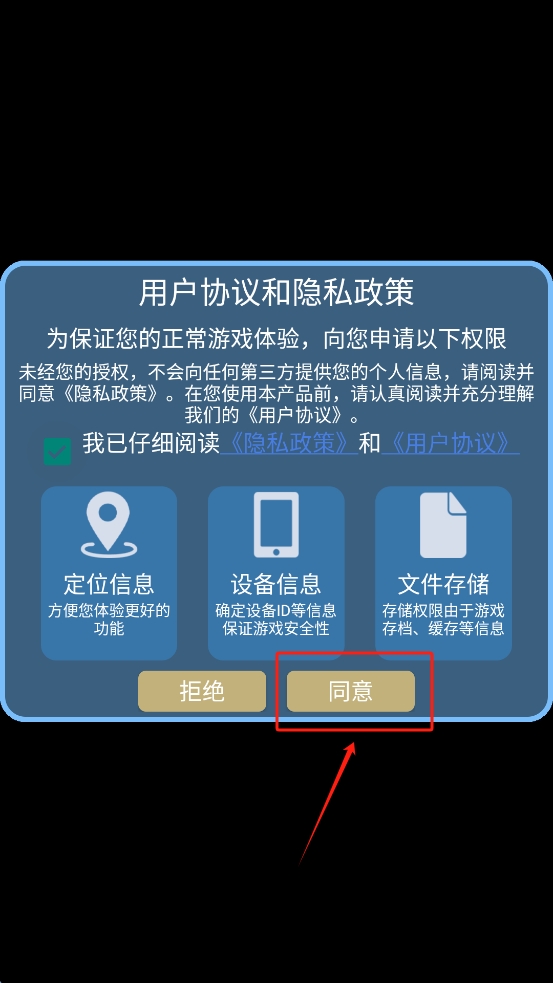 1、同意用户协议:在游戏开始前,阅读并同意《用户协议和隐私政策》,点击“同意”按钮以继续。