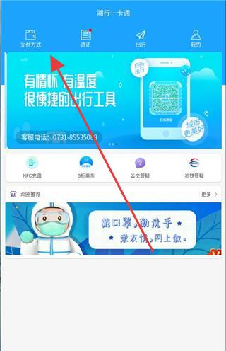 1、打开长沙地铁公交一卡通,点击【支付方式】。