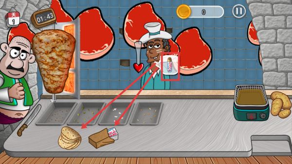 1、根据顾客需求,快速找到并选取对应的食材,如将酱料等放到合适位置,注意在【01:43】的倒计时内完成操作。