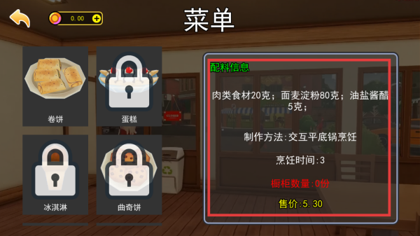 3、解锁新菜品如卷饼后,依据【菜单】的信息(肉类食材20克、面麦淀粉80克、油盐酱醋5克),使用交互平底锅,在时间内完成烹饪制作。