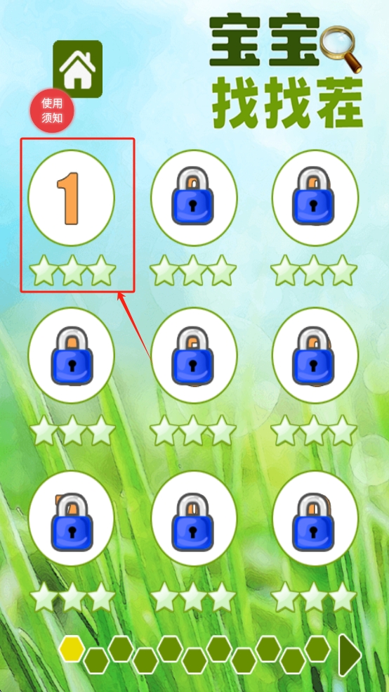 3、选择关卡:在关卡选择界面,点击数字“1”选择第一关,开始挑战。