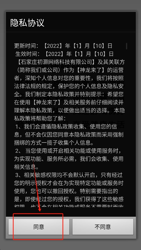 1、接受隐私协议:在游戏启动时,阅读并点击“同意”以接受隐私协议。