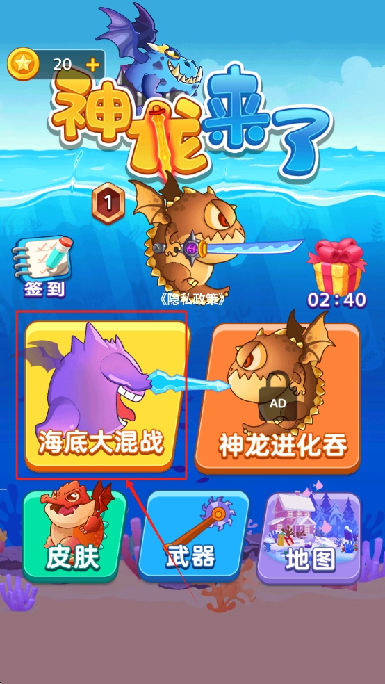 2、进入主界面:在游戏主界面,选择一个模式,点击“海底大混战”模式进入开始游戏。