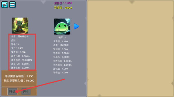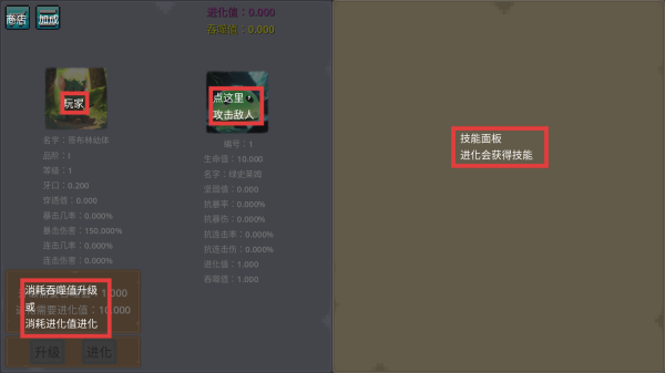 1、【玩家】可通过【点这里,攻击敌人】获取资源,利用【消耗吞噬值升级】或【消耗进化值进化】提升实力。
