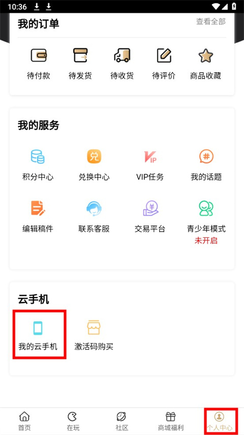 1、进入【个人中心】,点击【我的云手机】管理云手机相关服务。