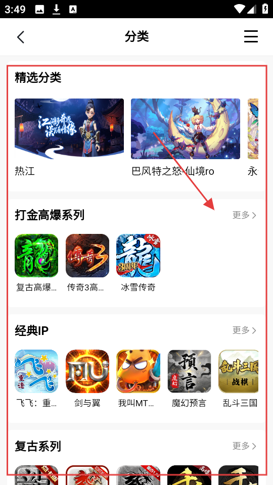 2、进入分类页面,有【精选分类】【打金高爆系列】等不同游戏分类,方便挑选喜欢的游戏类型哟。