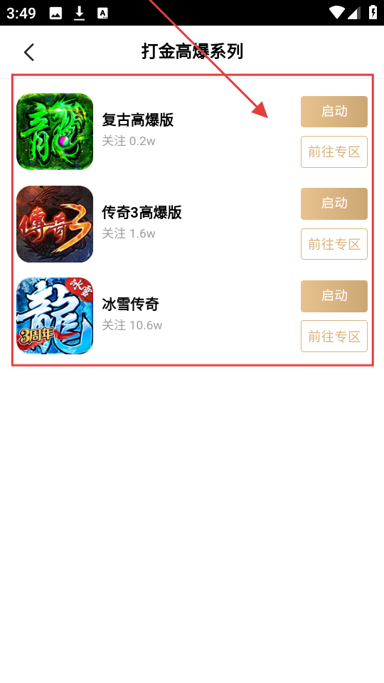 3、点开【打金高爆系列】分类,里面有【复古高爆版】等多款游戏,想玩哪款点【启动】就行啦。