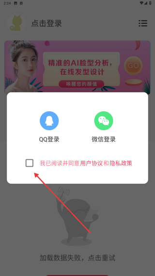 2、在弹出的登录选项窗口中,勾选【我已阅读并同意用户协议和隐私政策】。