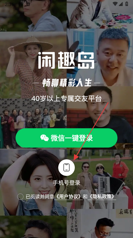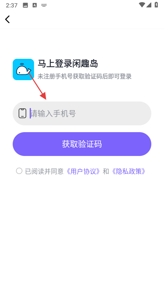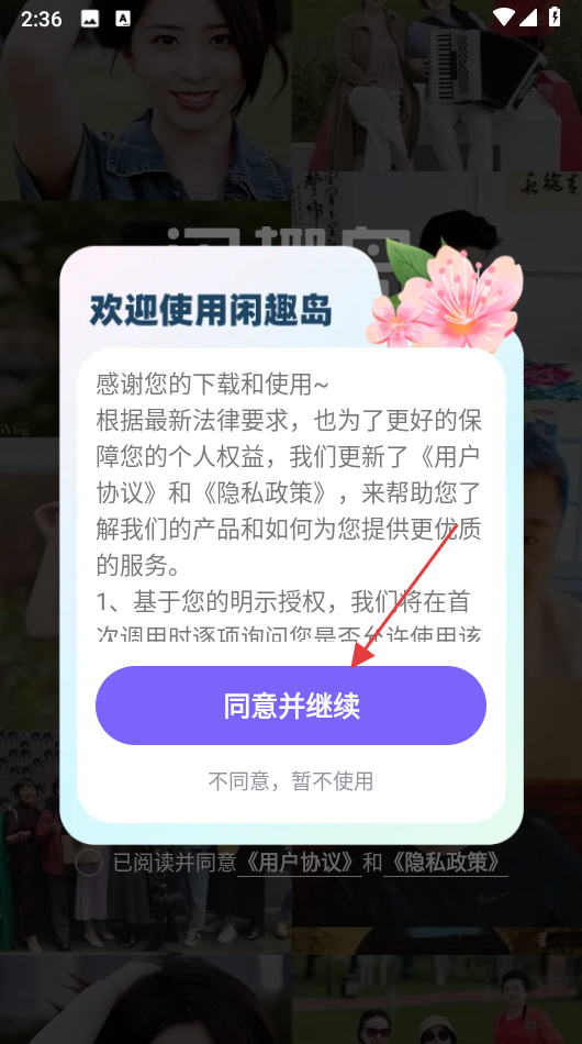 1、打开闲趣岛APP,点击【同意并继续】接受用户协议和隐私政策。