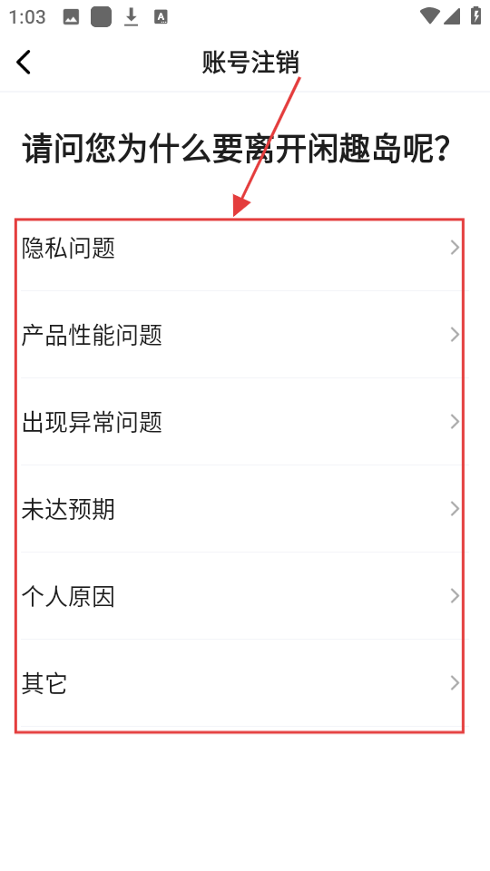2、进入账号注销页面后,需选择离开原因,如隐私问题、产品性能问题等,按需选择即可啦。
