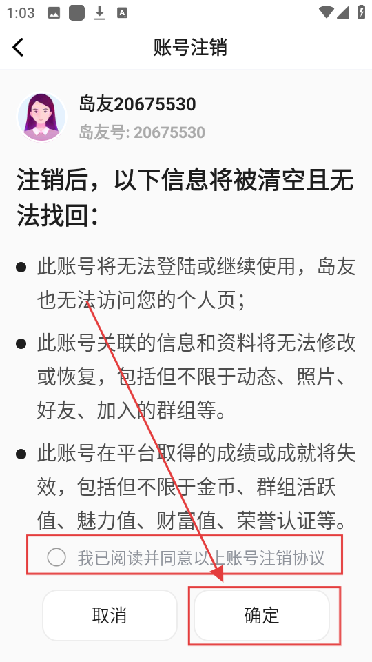 3、选择原因后,需阅读并同意账号注销协议,勾选后点击【确定】按钮,提交注销申请哦。