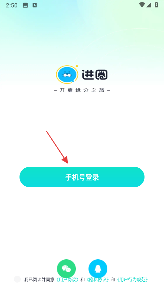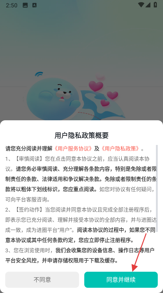 1、打开进圈APP,点击【同意并继续】接受用户隐私政策概要。