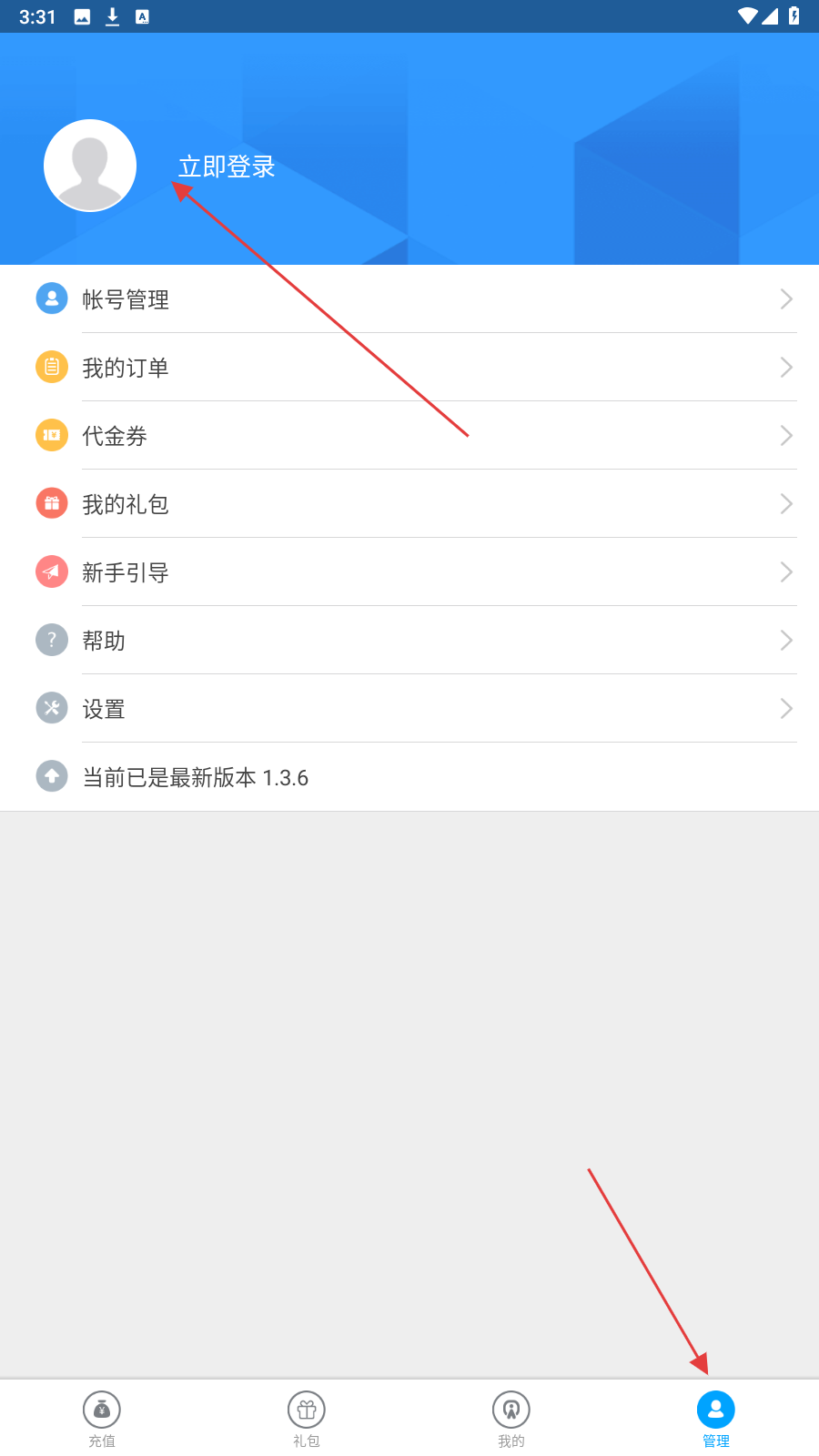 1、在应用中点击【管理】-【立即登录】,进入注册登录页面。