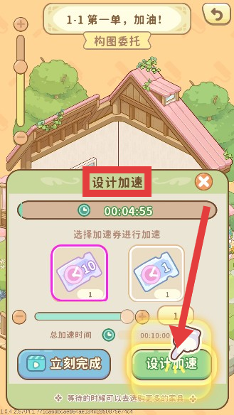 2、利用【设计加速】功能,使用加速券缩短设计时间,或点击【立刻完成】快速推进任务。