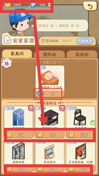 3、在【安家家居】商店,依据金币和钻石数量,按需购买【温馨之选】【安家精选】等家具完成任务。