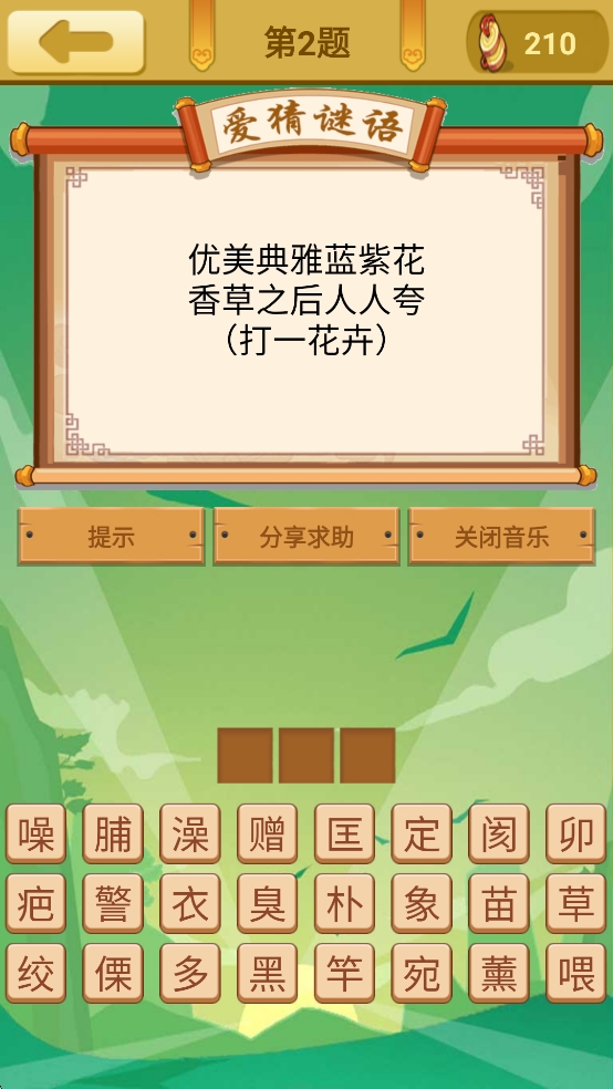 2、简约清新界面:界面设计简洁直观,操作流畅无负担,让玩家专注于谜题本身,沉浸在猜谜氛围中。